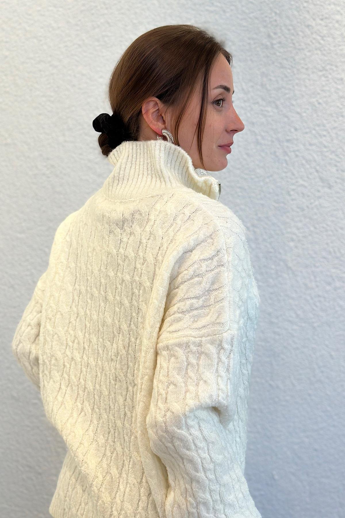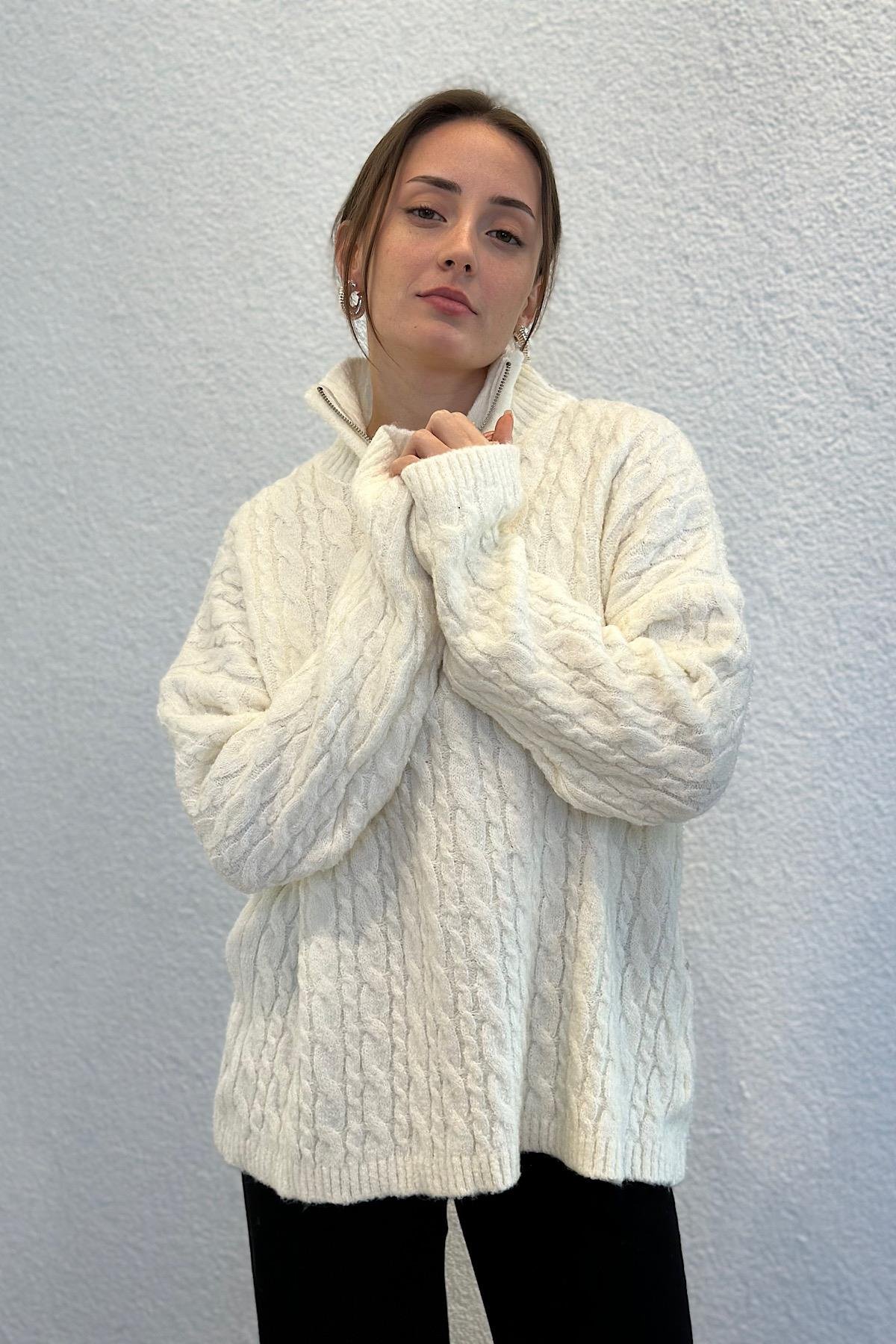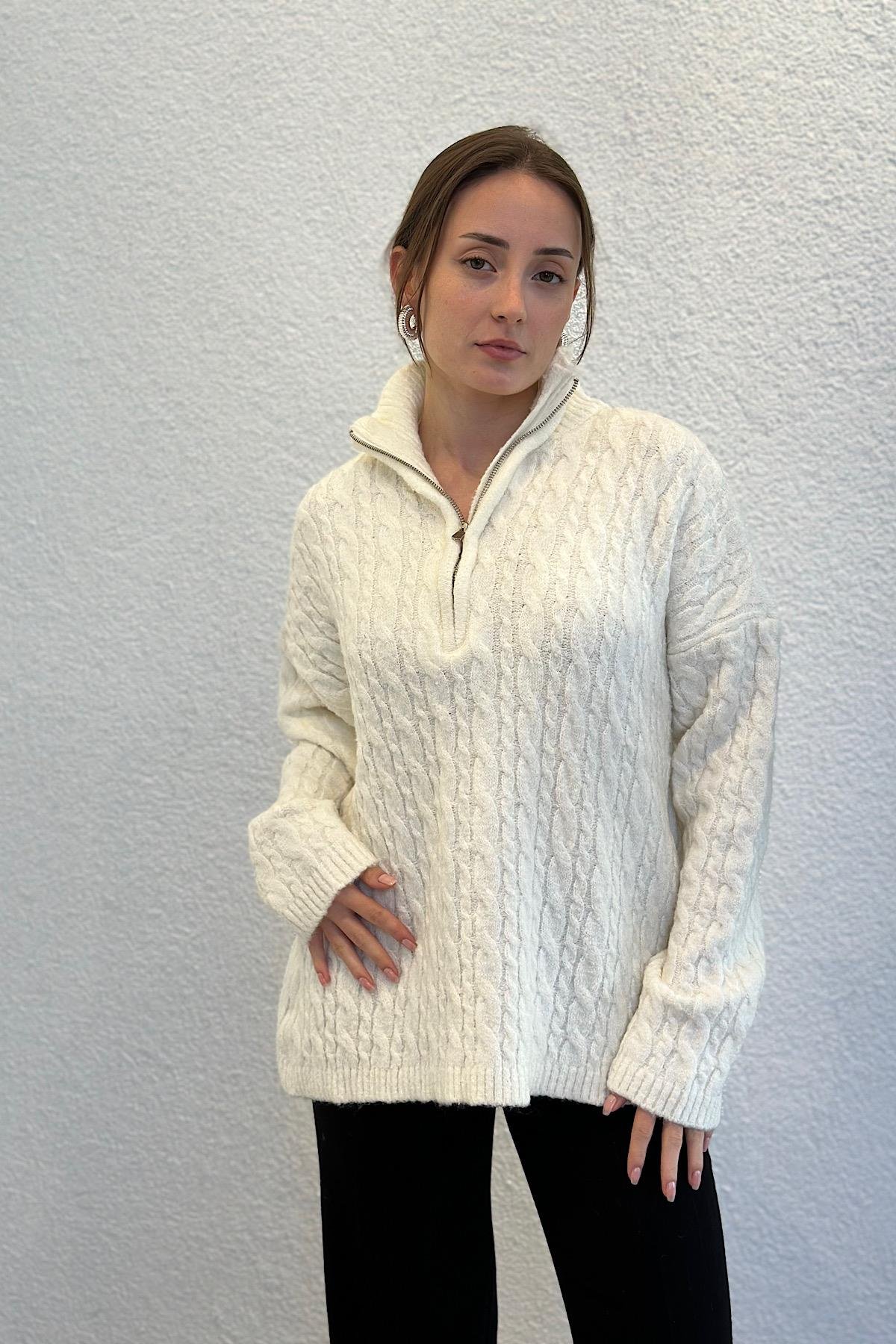 Oversize Yünlü Yakası Fermuarlı Premium Triko Kazak